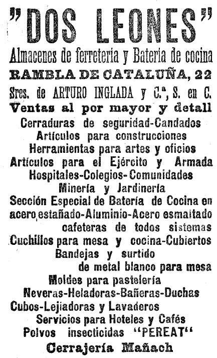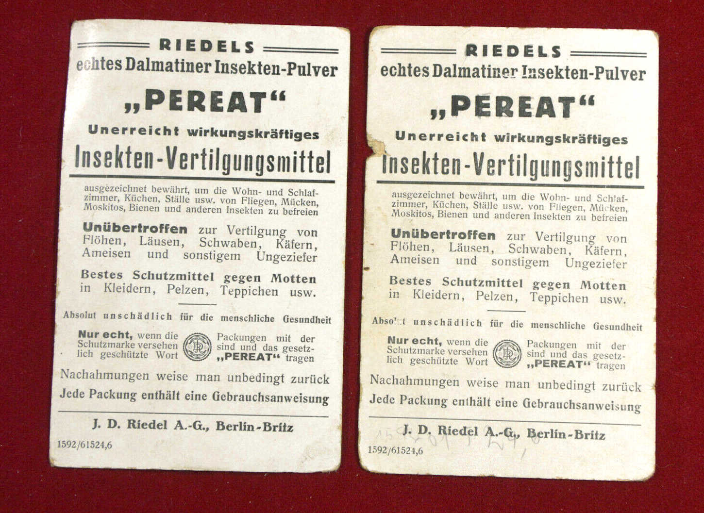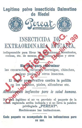 Alemania se caracterizó en esa época por sufrir una severa transformación industrial que la convirtió en una de las naciones más prósperas de Europa. Dotados los alemanes de gran capacidad para generar negocio, los hijos de J.D. Riedel debieron pronto de empaquetar los polvos de pelitre para convertirlos en un producto propio y exportable. No sé en qué año llegó Pereat a España. El primer anuncio donde se menciona lo he encontrado en el periódico ABC en un ejemplar del 24 de abril de 1909 (figura 5). Se trata de un sencillo anuncio de la ferretería I. Orueta de la calle Peligros de Madrid donde se enumeran algunos de los productos disponibles en este establecimiento. Deduzco del anuncio que Pereat era bien conocido y la ferretería lo menciona como un importante reclamo. Un año más tarde, en el periódico La Vanguardia aparece un anuncio similar publicado el 12 de mayo de 1910 (figura 6). Podemos leer que los almacenes de ferretería Dos Leones de la Rambla de Cataluña de Barcelona tienen a disposición del cliente, entre otros productos, los polvos insecticidas Pereat. Hasta 1915 se pueden encontrar en ambos periódicos anuncios similares. El último lo encuentro en la edición del 23 de junio de 1915 del ABC (figura 7). Los polvos insecticidas están a la venta en Marín, plaza de Herradores de Madrid, al precio de 50 céntimos. Por el momento, no tengo más información sobre Pereat.