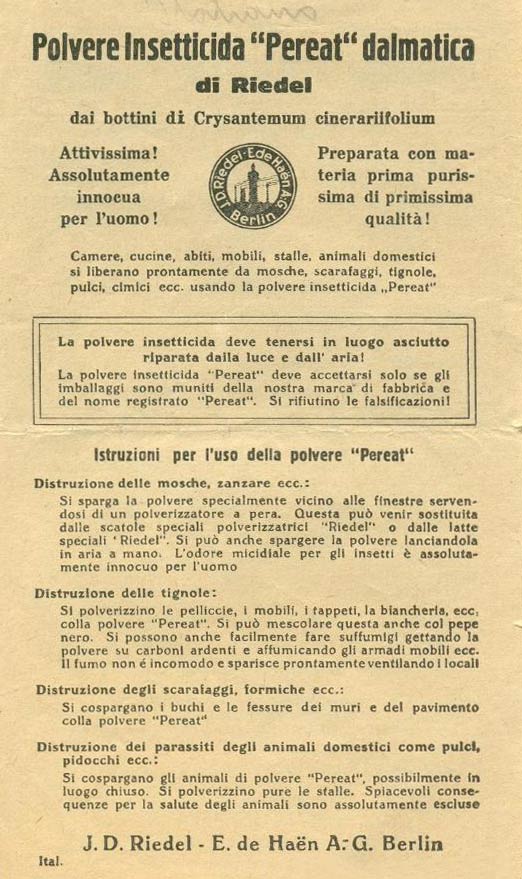 Los polvos de Dalmacia, como he comentado antes, estuvieron disponibles en las farmacias a partir de mediados del siglo XIX. Estos polvos consistían en flores molturadas de la planta llamada pelitre o piretro (Tanacetum cinerariifolium). También fueron llamados con anterioridad polvos persas, ya que una planta del mismo género originaria de Persia tenía el mismo poder insecticida.