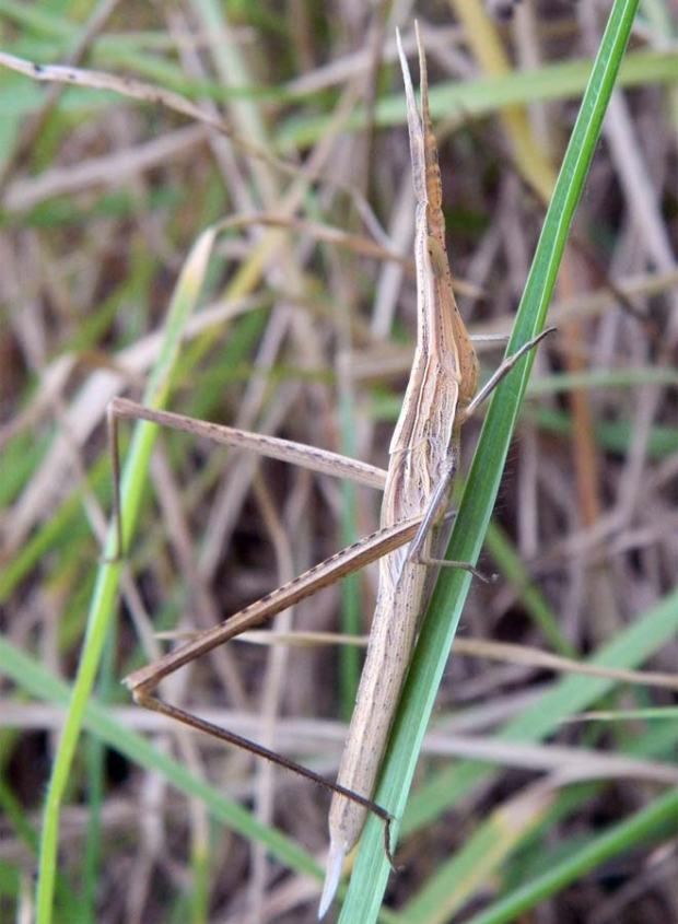 Otra manera de saber la especie es tener en cuenta su distribución. En la Península Ibérica, Truxalis nasuta se encuentra en el centro y en el sur. Mientras que Acrida ungarica es más corriente en el norte y en la costa mediterránea. En Cataluña, por ejemplo, se encuentran ambas especies. Truxalis nasuta está en la provincia de Lérida, mientras que Acrida ungarica la encontramos en la zona litoral. Una última manera de determinar la especie es observando cuándo aparecen los adultos. Según los manuales, los adultos de Truxalis nasuta están presentes en junio. En cambio, los de Acrida ungarica se dejan ver de julio a noviembre. Esto concuerda con algunas fotos de esta entrada que fueron hechas en el mes de octubre. Parece ser que la hembra sobrevive mayor tiempo al macho. Por lo cual, en el otoño se verán básicamente hembras. Espero que las fotos sean ilustrativas.