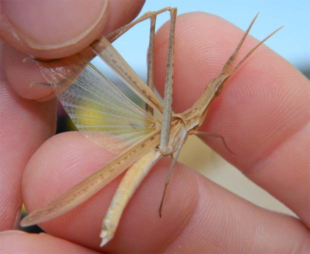 El color del saltamontes narigudo es variado. La mayoría son de color paja, aunque también pueden ser verdes. Parece ser que el verde es más abundante entre las hembras. Para distinguir ambos géneros hay que atender a las dimensiones. La hembra es de mayor tamaño que el macho. Las dimensiones de los ejemplares adultos están entre los 3 y los 7 centímetros. Las ninfas se distinguen de los adultos no solo por su tamaño, sino porque no poseen alas completas. En la foto número 4 se puede ver un ejemplar joven. Los saltamontes narigudos tienen tan solo una generación anual. Como he comentado, ambas especies son parecidas. Pero, ¿cómo las podemos diferenciar? La mayoría de los caracteres que diferencian ambas especies requieren buenas dotes de observación. Aunque hay una manera fácil de hacer una distinción. Para ello debemos cazar un saltamontes narigudo y mirar el color de las alas. Si estas son transparentes, entonces estamos ante la especie Acrida ungarica. Pero si tienen una coloración morada, lo que tenemos es un ejemplar de Truxalis nasuta. En las fotos número 6 y 7 podemos ver que las alas son transparentes. Esto significa que los saltamontes narigudos del río Besós a la altura de Barcelona son de la especie Acrida ungarica.