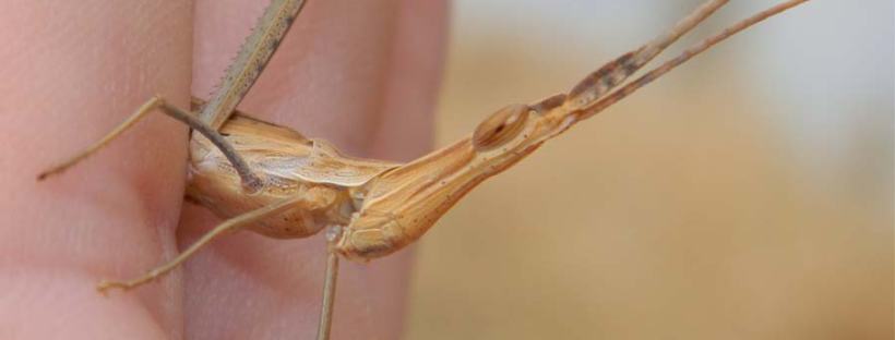 En la Península Ibérica tenemos dos especies de saltamontes narigudo. Estas son Acrida ungarica y Truxalis nasuta. Ambas son casi idénticas en forma y tamaño y difíciles de distinguir a simple vista. Son unos saltamontes que a mí me parecen de gran belleza. Están bien adaptados por su forma para mimetizarse con el paisaje donde viven. Es fácil confundirlos con una ramita. Las antenas parecen extremos de hierbas. Estos insectos deben de estar tan convencidos de que pasan desapercibidos con su camuflaje que cuando te acercas para cogerlos, se quedan quietos. Te puedes aproximar tranquilamente y agarrar uno con las yemas de los dedos. Ellos a penas hacen esfuerzos para zafarse. Podemos encontrarlos en herbazales y prados. En la zona donde vivo son abundantes. Las fotografías las he realizado junto al río Besós, en el término municipal de Santa Coloma de Gramanet. Al finalizar el Parque Fluvial del Besós, subiendo hacia Montcada, empieza un camino de tierra paralelo al río. Es una zona húmeda en la que hay una gran variedad de animales. Me gusta mucho moverme por esta zona para observar insectos y aves.