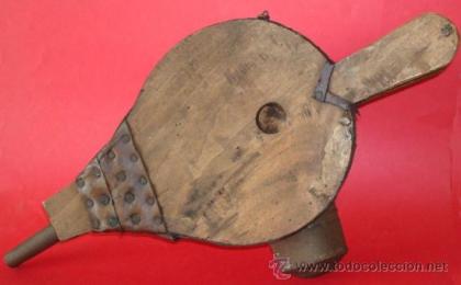 Antonio Caubet fue un industrial que empezó su negocio en Marsella, pero que se acabó instalando en Barcelona. El funcionamiento de estos fuelles es sencillo. Por el agujero por donde entra el aire se introduce el polvo insecticida. Luego se cierra el agujero con un tapón de corcho. El aire sale mezclado con el polvo insecticida y lo esparcía por el ambiente. Esto producía una polvareda nada agradable. Aunque las ganas de matar cuantas moscas hubiera en una habitación debían de superar los inconvenientes. En las imágenes 6 y 7 se puede ver un espolvoreador de fuelle un poco más elaborado. El insecticida no se introduce en el interior del fuelle, sino en un receptáculo a parte. Esto permite cargar más polvo para poder esparcirlo de forma más cómoda. Los espolvoreadores de fuelle no permiten la dispersión del polvo de una manera homogénea. Fueron una buena solución para su época. Lo que no sé es en qué momento fueron introducidos estos aparatos. Quizás con la aparición de polvo de Dalmacia a partir de la segunda mitad del siglo XIX.
