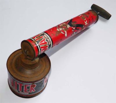 Hace unos días, un amigo me regaló un pulverizador de émbolo de la marca Waiter (figura 1). Lo encontró en un mercadillo de antigüedades. Al ver la marca me quedé pensativo. No la conocía. Tenía el dibujo de un botones portando un pulverizador al hombro a modo de soldado y se podía leer como fabricante «Tat Yuen Factory, made in Hong Kong». También se puede leer esto en letras pequeñas: «New style sprayer adopted 1949». Fuera de estos datos que proporciona el mismo pulverizador, no he encontrado nada más en internet. Ahora bien, viendo el dibujo del botones como imagen de marca, puedo afirmar que parece inspirado en el soldado del insecticida Flit [1]. El pulverizador de émbolo estaba pensado para dispersar en un ambiente un insecticida de formulación líquida. Este aparato funciona como una mancha para hinchar ruedas de bicicleta. En la parte delantera se le ha añadido un receptáculo donde se introduce el líquido insecticida. Justo delante del orificio de salida del aire de la mancha hay una cánula que conecta con el receptáculo. Cuando hay líquido en este, la cánula queda cebada. Al empujar el émbolo hacia adelante, el aire sale por el orificio y crea una diferencia de presiones que empuja el líquido hacia arriba por la cánula. Al quedar entonces el líquido expuesto al aire, se rompe y se dispersa en forma de pequeñas gotas. El empuje del líquido hacia arriba sigue el principio de Bernoulli.