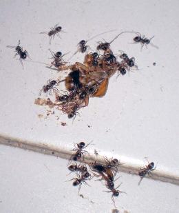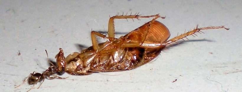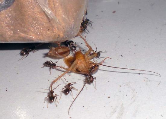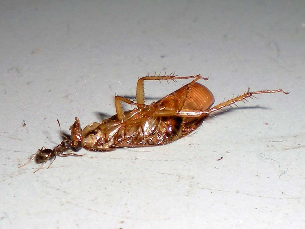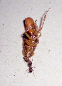 Fig 1. Hormiga obrera llevando ella sola el cuerpo de una cucaracha germánica hembra./ Desinsectador 07-2013