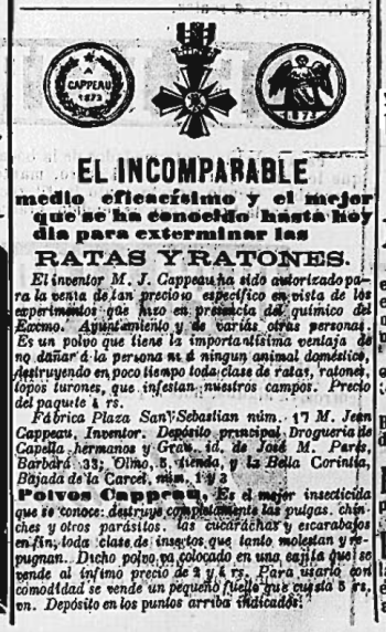 Hace unos días busqué viejos anuncios de productos de control de plagas en hemerotecas disponibles online. Dejé a un lado los productos para uso agrícola y me centré en los de uso doméstico. Encontré algunos antiguos de la segunda mitad del s. XIX que hacían referencia al comerciante francés Jean Cappeau.