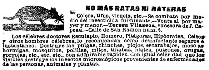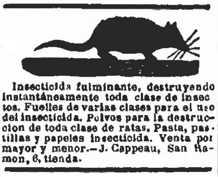 El primero que encontré fue publicado en el periódico ‘El Anunciador Catalán’ del domingo 24 de febrero de 1878 (figura 1). Se anuncia el raticida El Incomparable y el insecticida Polvos Cappeau. El raticida se presenta como un polvo de gran eficacia para exterminar ratas y ratones. Tiene la importante «ventaja de no dañar á la persona ni á ningun animal doméstico, destruyendo en poco tiempo toda clase de ratas, ratones, topos turones, que infestas nuestros campos». Se vendía el paquete a 4 reales. Dato importante es que es un producto original que ha sido autorizado para la venta inventado por Jean Cappeau. El producto es fabricado en la plaza San Sebastián, 17, de Barcelona. Se mencionan las tiendas donde se puede adquirir.