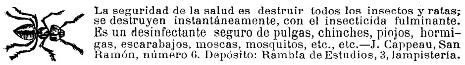 Se trata de un anuncio muy interesante. Se hace hincapié en la destrucción de animales dañinos para proteger la salud. Se dice que enfermedades como el cólera, tifus, viruela, etc., se combaten por medio del Insecticida Fulminante. Se explica que «con igual celeridad que los visibles destruye los insectos microscópicos provenientes de enfermedades de las personas, animales y plantas». Y junto al término insecticida se habla de desinfección. Se utiliza el adjetivo «desinfectante». Esto da cuenta de la influencia en aquella fecha de los descubrimientos de Louis Pasteur y su teoría de que en el origen de determinadas enfermedades se encontraban los microorganismos. Y para prevenir contraer la enfermedad, había que evitar su propagación por medio de la desinfección. Esta teoría fue el germen de los servicios de desifencción, desinsectación y desratización.