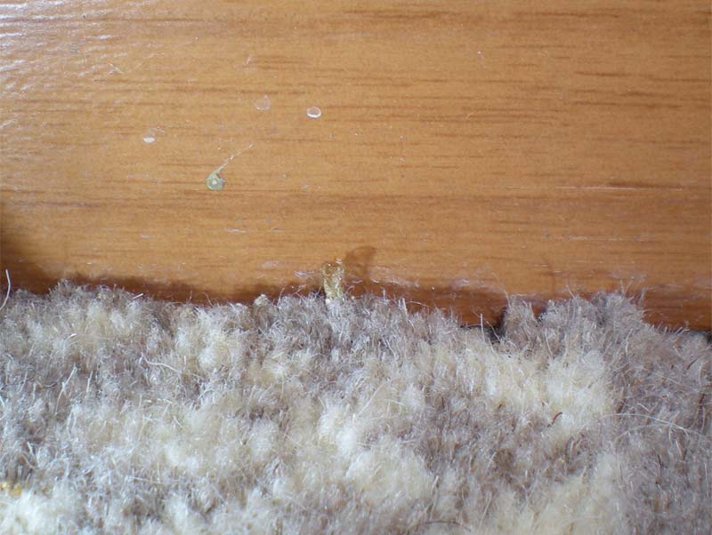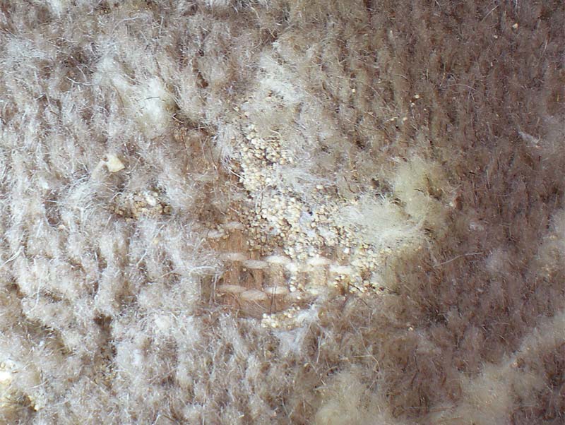 La polilla de la ropa, Tineola bisselliella, está especializada en comer el pelo de los animales, el cual está compuesto de una proteína llamada queratina. Además del pelo, la queratina está en los cuernos, plumas, uñas y pezuñas. Esta capacidad de vivir tan solo de pelo les ha dado una ventaja sobre el resto de especies. Ellas tienen comida exclusiva y en abundancia. Las polillas suelen ser de los últimos comensales en pasar por un cadáver. La ropa hecha con lana es, por tanto, susceptible de ser atacada por la larva de la polilla. Recientemente estuve en una habitación de hotel donde me encontré con polillas. Al acercarme para observarlas, vi que se trataba de polillas de la ropa. El suelo de la habitación estaba cubierto de moqueta. Debajo de la cama se podían ver pequeños claros causados por la voracidad de las larvas. He aquí algunas fotos.