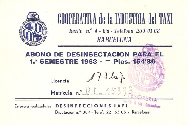 En la página de compra-venta Todocolección (todocoleccion.net), he encontrado un documento interesante de 1963. Se trata de un abono de desinsectación emitido por la Cooperativa de la Industria del Taxi de Barcelona. En la parte inferior, aparece la empresa Desinfecciones Lafi como realizadora de la desinsectación. Esta empresa de control de plagas sigue hoy en activo en Barcelona. Si consultamos su página web (desinfeccioneslafi.com),  se puede leer que en el año 1948 inició su actividad. La empresa fue fundada por Ángel de Loaysa Gómez, quien la regentó hasta su fallecimiento en 1976 [1]. Se hizo cargo del negocio su hija María del Carmen, quien hasta la actualidad continua con el negocio familiar.
