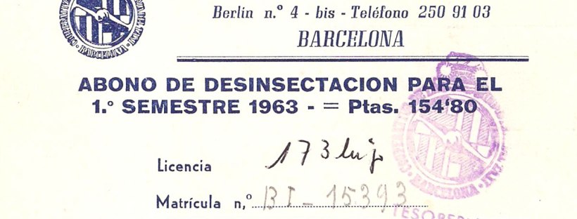 En la página de compra-venta Todocolección (todocoleccion.net), he encontrado un documento interesante de 1963. Se trata de un abono de desinsectación emitido por la Cooperativa de la Industria del Taxi de Barcelona. En la parte inferior, aparece la empresa Desinfecciones Lafi como realizadora de la desinsectación. Esta empresa de control de plagas sigue hoy en activo en Barcelona. Si consultamos su página web (desinfeccioneslafi.com),  se puede leer que en el año 1948 inició su actividad. La empresa fue fundada por Ángel de Loaysa Gómez, quien la regentó hasta su fallecimiento en 1976 [1]. Se hizo cargo del negocio su hija María del Carmen, quien hasta la actualidad continua con el negocio familiar.
