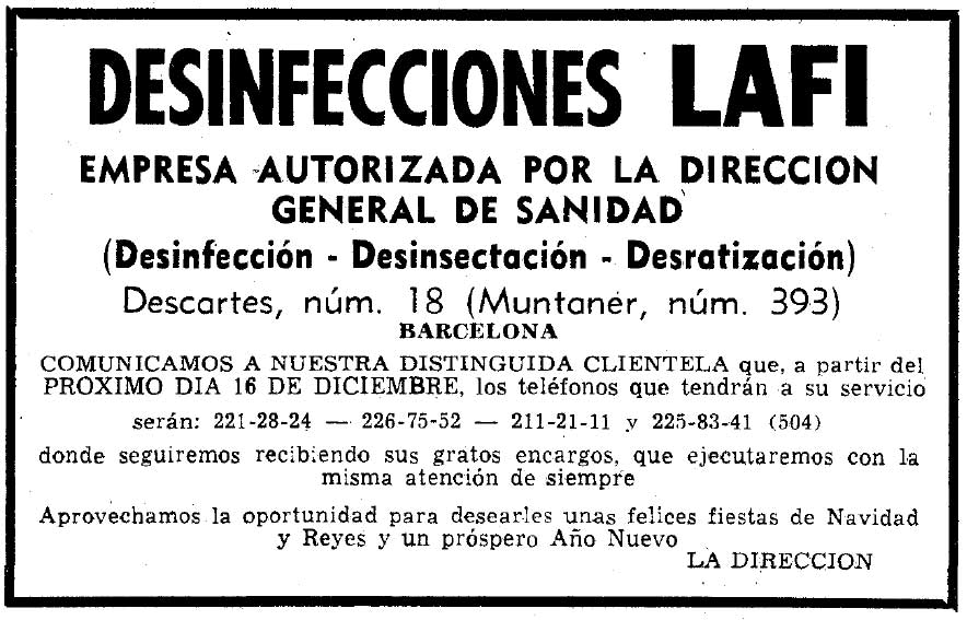 Para acabar, en la imagen número 2 se puede ver un anuncio aparecido en 1967 en el periódico La Vanguardia. Esto es lo único que he podido rascar de las hemerotecas sobre Desinfecciones Lafi. En el anuncio se informa de los números de teléfono que habrá a disposición de los clientes. Esta empresa se puede encontrar hoy en día en el mismo emplazamiento que podemos leer en el anuncio, en la calle Descartes, 18, de Barcelona.