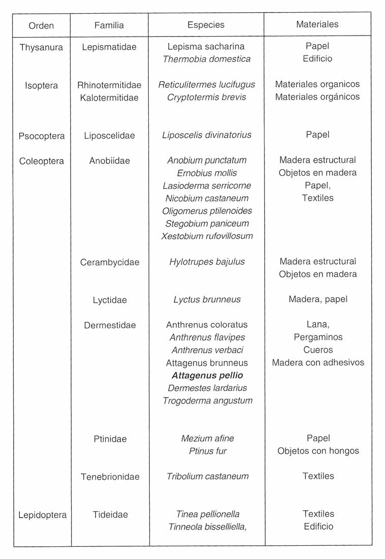 De todos los textos, me quedo con dos. Uno es el escrito por Eva Pérez Martín titulado ‘La desinsectación con microondas como sistema alternativo, experimentación y estado de la cuestión’. Es un texto técnico donde se detallan las experiencias realizadas para la desinsectación de maderas atacadas por carcoma. El otro es el de la gran especialista Nieves Valentín, cuyo título es ‘Retablos, análisis de su biodeterioro, infestaciones y su erradicación’. En este podemos encontrar una tabla con todos los insectos que participan en la degradación de una obra de arte y que reproduzco a continuación (figura 2).