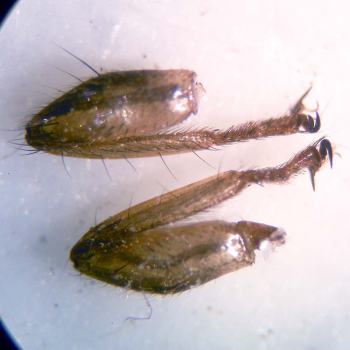 Otra parte del cuerpo que tiene bien desarrollada la mosca de las palomas son las patas. En la imagen número 3 se pueden ver las dos patas delanteras. Son robustas. Bien preparadas para asirse a las palomas. No es fácil agarrarse a un animal que tiene plumas. Me ha sorprendido su observación a través de la lupa binocular, ya que tiene poderosas uñas en sus extremos que actúa como pinzas. También destacan en sus patas las numerosas cerdas. Algunas de estas son bastante largas. Entiendo que esto también le ayuda a sujetarse a las plumas. Si yo fuera una paloma y tuviera una de estas moscas sobre mi cuerpo, creo que tendría un serio problema para deshacerme de esta. En general, el aspecto de la mosca de las palomas es robusto. Y tiene el cuerpo alargado y plano, ideal para meterse entre las plumas y quedar escondida. Vista desde lejos, con sus patas recias y extendidas, puede parecer una araña. Los ejemplares que recogí estaban bastante secos y tienen el abdomen muy encogido. En la imagen número 4 se puede ver uno de los ejemplares sobre papel milimetrado. Desde el hipostoma hasta el extremo posterior de las alas mide casi 10 mm.