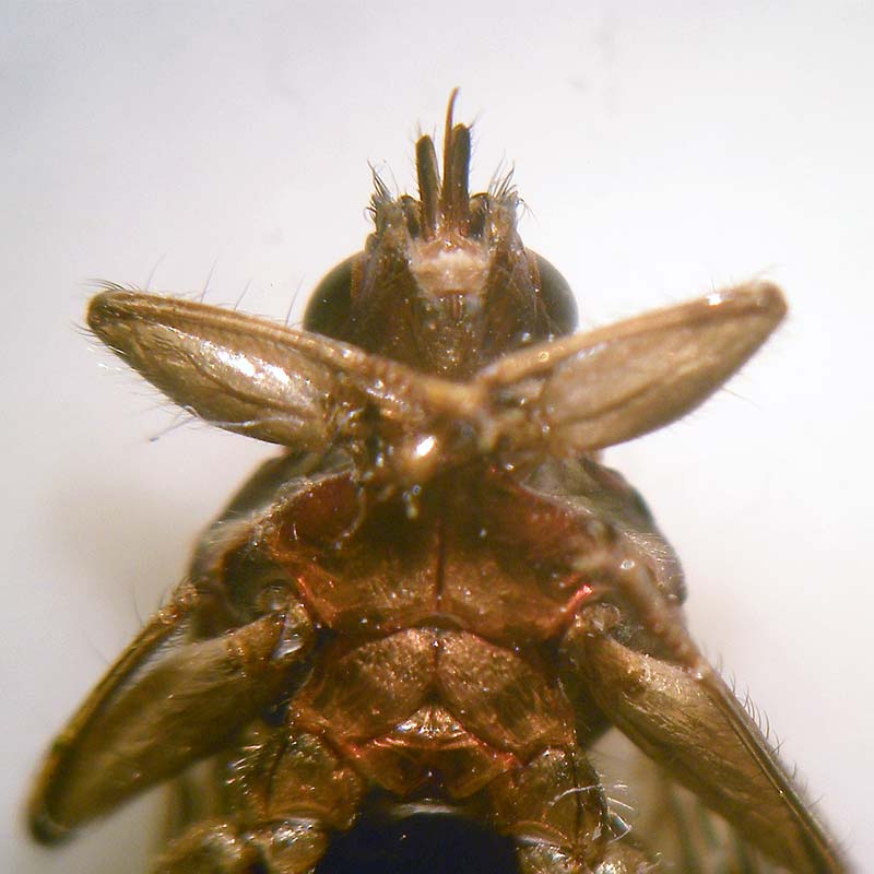 Parece que no posee una gran capacidad de vuelo, la justa para moverse por un palomar. Lo que sí tiene es un cuerpo bien preparado para sangrar a las palomas. En la imagen número 2 se puede ver una mosca vista desde su parte inferior. De la cabeza pende el aparato bucal chupador que recibe el nombre de hipostoma. Este guarda similitud con el aparato chupador de las garrapatas duras (Ixodidae). Es curioso como la función parece que crea el órgano. Las garrapatas y estas moscas son artrópodos evolucionados en ramas diferentes del árbol de la vida. Sin embargo, ambos han desarrollado órganos similares para una misma función. Espero que se aprecien bien las fotos, porque con la lupa binocular tengo un problema de foco. En óptica, como es sabido, cuanto más te acerques a al objeto a través de aumentos, menos profundidad de campo tienes.