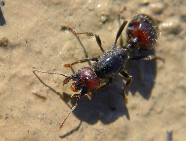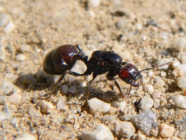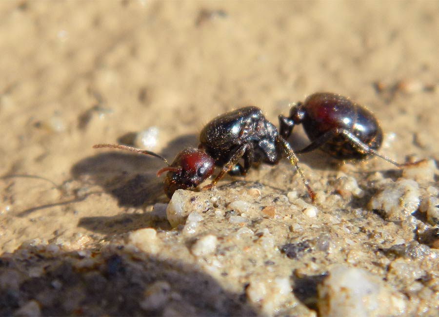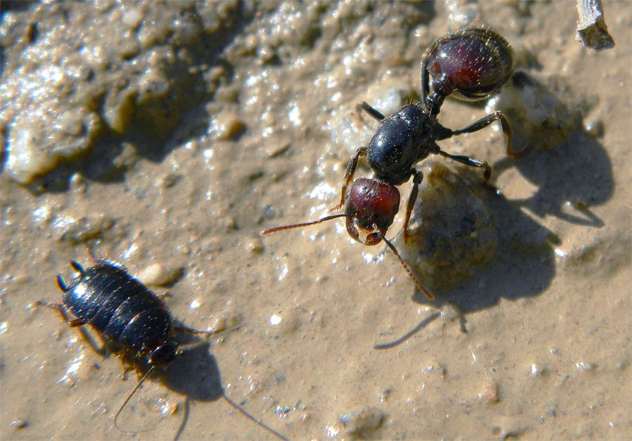 Fig 1. Una reina de la especie Messor barbarus junto a una cucaracha silvestre Loboptera sp, bebiendo de un charco./ C. Pradera 10-2013