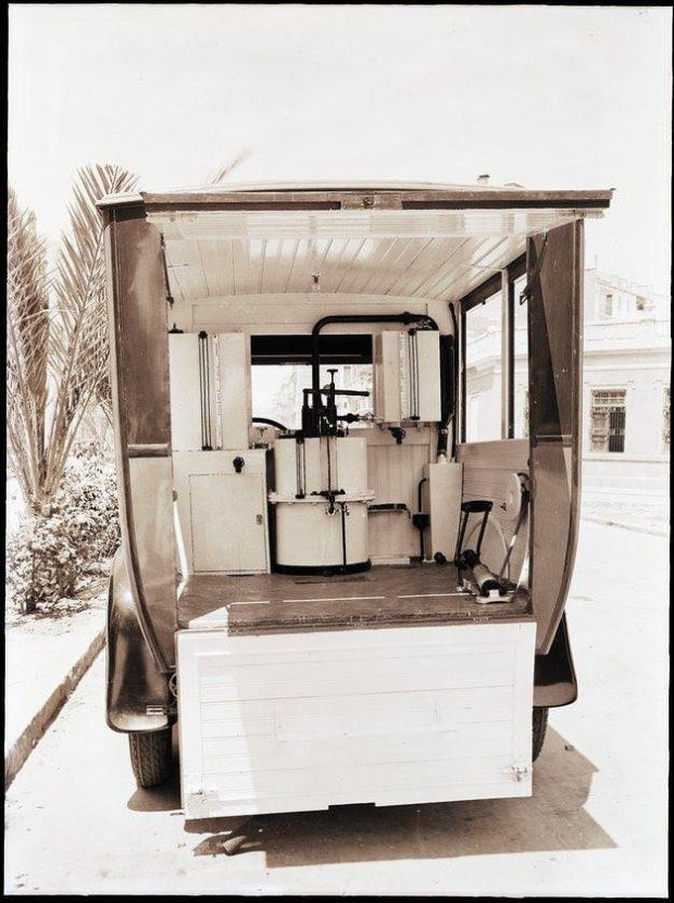 Fig 9. Pie de foto: «Para la mayor rapidez en las operaciones de desinsectación de hoteles, fondas, teatros, etc., nuestros aparatos cianhidrizadores van montados en coches automóviles» (pág. 81).
