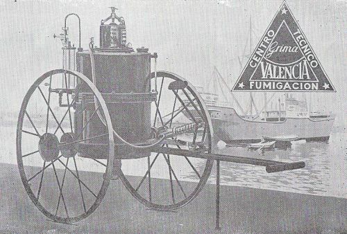 Aprovecho los datos de este libro para explicar un poco la evolución de la aplicación de este gas en España. Empezó primero aplicándose en el ámbito agrícola hacia 1910 para pasar luego al sanitario gracias a las innovaciones realizadas por Casa Grima mediante del diseño de unos aparatos que permitían su manejo de una manera bastante segura hacia 1920. La fumigación con el ácido cianhídrico requería manos expertas, aunque la peligrosidad del mismo conllevó la muerte de personas tanto en su fase de aplicación como debido a personas que no apercibidas penetraban en las zonas tratadas. No se podría cuantificar cuántas personas fueron afectadas por su aplicación, pero no fueron pocas, ya que se encuentran noticias en los periódicos de la época.