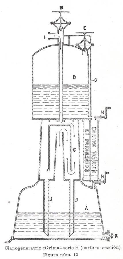 En 1927 el Centro Técnico de Fumigaciones Casa Grima editó un opúsculo dedicado al uso del ácido cianhídrico (HCN) [1]. Es muy interesante su lectura. A mí me ha permitido conocer un poco mejor la importancia que este gas tuvo a principios de siglo. Hay otra edición posterior de 1929 a la cual no he tenido acceso. El libro consta de 82 páginas y está ilustrado con fotografías y dibujos. Fue escrito para presentar las bondades de la cianhidrización mediante el sistema Grima, el cual llegó a ser uno de los sistemas más importantes para generar este gas en España, ya que fue adoptado por el Estado en diversas aplicaciones sanitarias para la desinsectación y desratización.