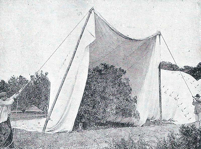 Al principio, el sistema que usaba Casa Grima para fumigar era el americano. Para ello, se generaba el gas dentro de un entoldado bajo el que quedaba cubierto el naranjo (figura 2). Bajo la lona se depositaba un generador, que consistía en un recipiente de arcilla pura cocida o bien de madera recubierta en su interior con plomo. Dentro se vertía agua y después ácido sulfúrico. Al hidratarse este ácido, se produce una elevación de la temperatura. Esto se aprovechaba para depositar rápidamente cianuro en estado sólido. Al mezclarse el cianuro con el ácido sulfúrico se produce una violenta reacción que genera el ácido cianhídrico. Este sistema conllevaba muchos peligros. El más evidente es que había que salir rápidamente del entoldado para no perecer. Poca cantidad de este gas basta para matar a una persona. Otra era que a veces en el generador quedaban restos de cianuro que, al verter el ácido sulfúrico sobre el agua, producían una reacción no esperada. El manejo del cianuro era peligroso, ya que si había mucha humedad ambiental, el ácido cianhídrico se producía de manera espontánea. Muchos operarios manejaban con las manos desnudas el cianuro, lo cual producía intoxicaciones. No fueron pocos los intoxicados.
