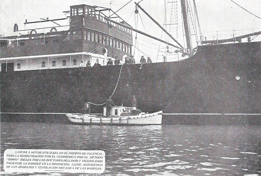 lancha-girma-01 Previous Next Publicado 19/10/2013 en 900 × 608 en ‘Aplicaciones sanitarias del ácido cianhídrico’ por Centro Técnico de Fumigación Casa Grima (1927) Foto 5. Lancha usada en el puerto de Valencia para proceder a la cianhidrización de barcos. Página 55.