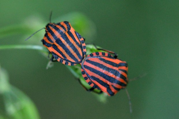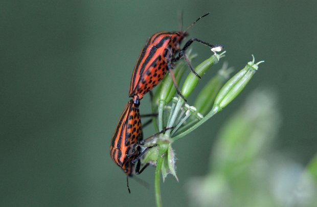 Las chinches son insectos de gran belleza. Como ejemplo de ello, baste la chinche rayada (Graphosoma lineatum), que se puede ver en esta entrada. El nombre científico con el que se bautizan a las especies suele ser descriptivo. El de esta especie no solo lo es, sino que permite memorizarlo. Podríamos traducirlo por cuerpo (soma) pintado (grapho) de líneas (lineatum). Aunque esta chinche no tiene todo el cuerpo con bandas longitudinales rojas y negras (figura 1). Si nos fijamos en la parte inferior del cuerpo, la tiene moteada de puntos negros (figura 2). Esto la hace realmente bonita.