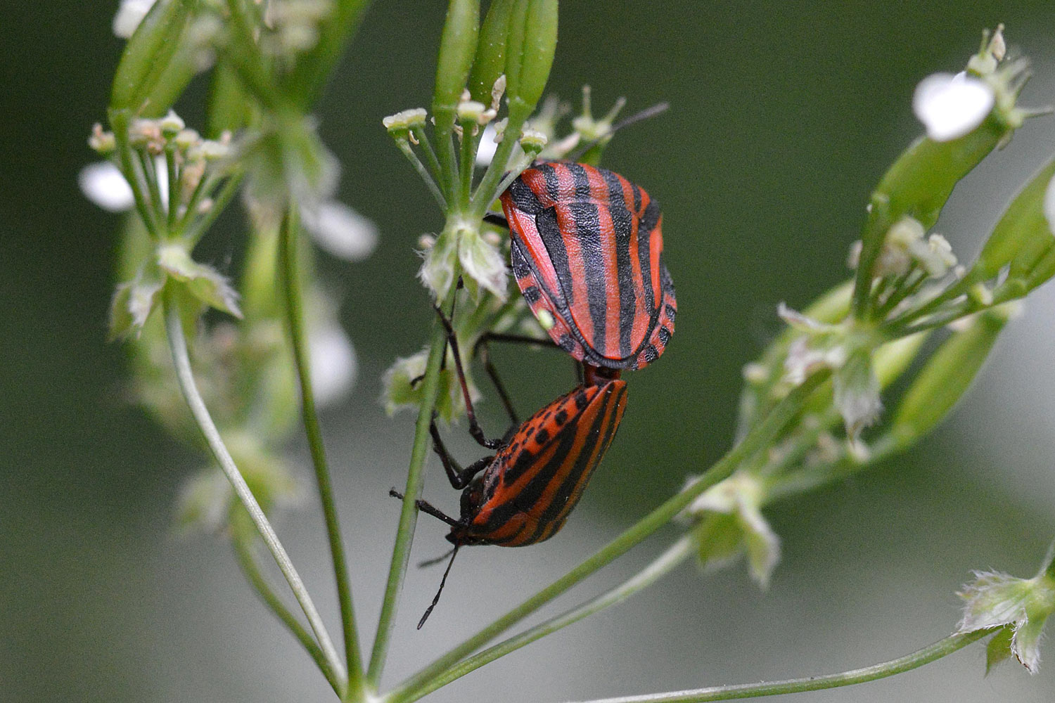 Las chinches son insectos de gran belleza. Como ejemplo de ello, baste la chinche rayada (Graphosoma lineatum), que se puede ver en esta entrada. El nombre científico con el que se bautizan a las especies suele ser descriptivo. El de esta especie no solo lo es, sino que permite memorizarlo. Podríamos traducirlo por cuerpo (soma) pintado (grapho) de líneas (lineatum). Aunque esta chinche no tiene todo el cuerpo con bandas longitudinales rojas y negras (figura 1). Si nos fijamos en la parte inferior del cuerpo, la tiene moteada de puntos negros (figura 2). Esto la hace realmente bonita.