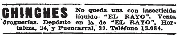 El Rayo es una de las muchas marcas de polvos y líquidos insecticidas a base de pelitre que aparecieron en España a principios de siglo XX. Esta marca fue comercializada por Felipe Gómez con sede en la calle Hortaleza, número 24, de Madrid. Tengo poca información sobre la marca El Rayo. El primer documento que he encontrado es un anuncio publicado en el periódico ABC en septiembre de 1927 (figura 1). También he encontrado uno publicado en marzo de 1930 en un ejemplar de la revista Siluetas donde se puede leer el precio (figura 2).