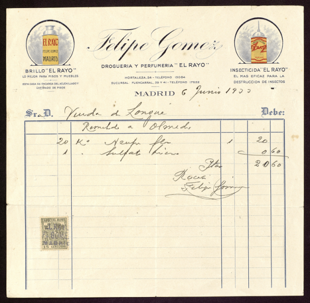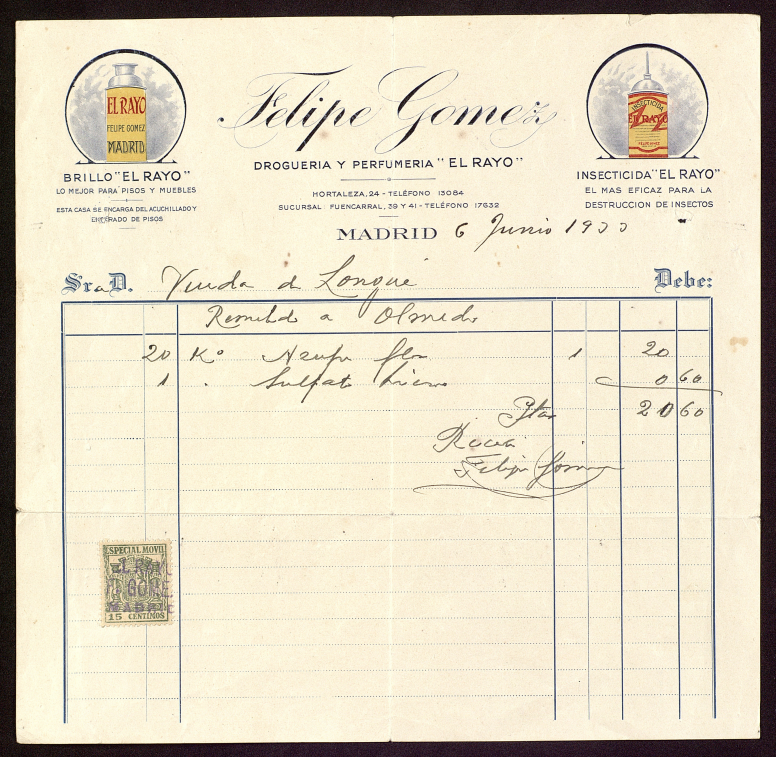 Felipe Gómez fue un comerciante de droguería y perfumería y no un formulador de insecticidas. Después de la Guerra Civil consta la empresa como Felipe Gómez SA. La marca El Rayo fue también utilizada para otros productos como un abrillantador para suelos y muebles (figura 7).