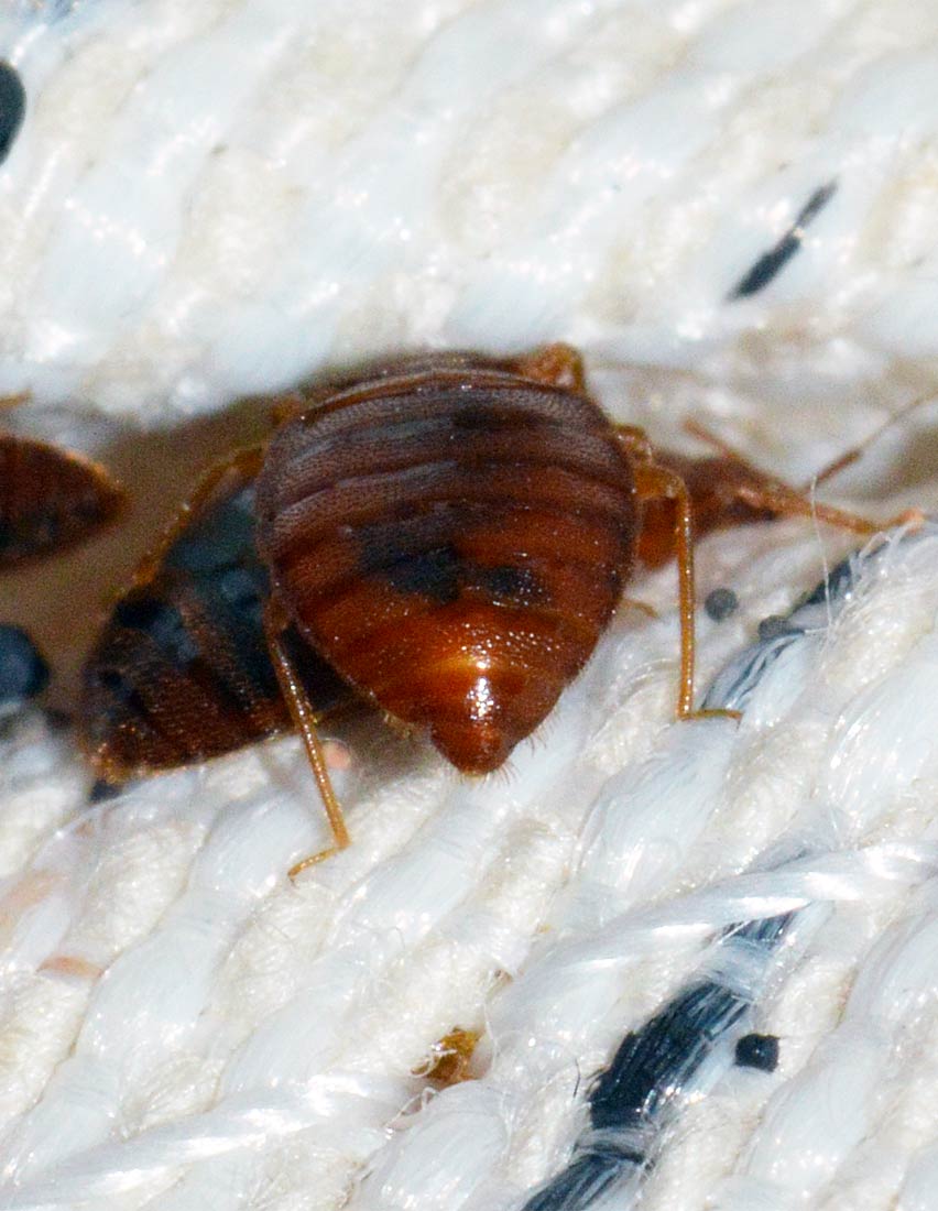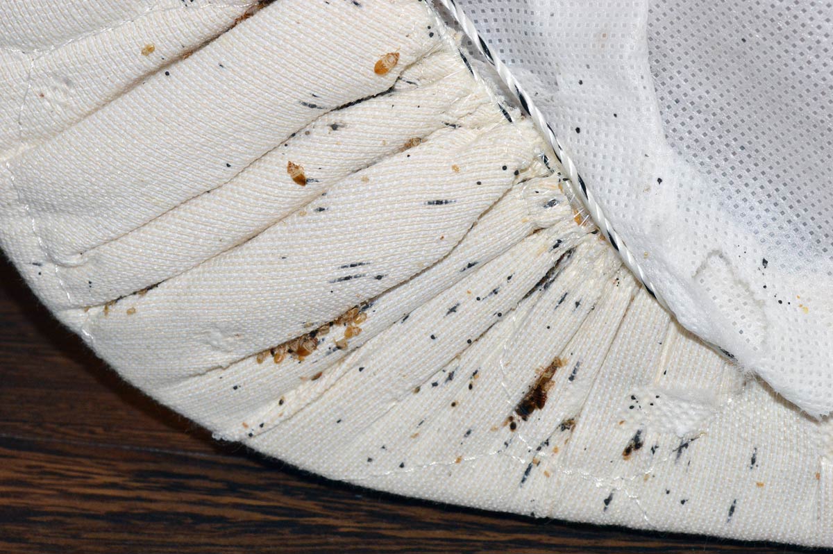 En las imágenes se puede ver la parte inferior de un somier de tipo canapé. Las chinches aprovechas los pliegues para descansar y realizar la puesta. Se pueden ver todos los estadios de crecimiento, así como mudas y las típicas manchas de excrementos. En la actualidad en los hoteles se utiliza el somier de tipo canapé. No es más fácil de tratar que el de tipo lamas. Ambos tienen sus dificultades. Y es uno de los elementos clave para el control de esta especie, ya que hay multitud de escondrijos donde pueden esconderse.