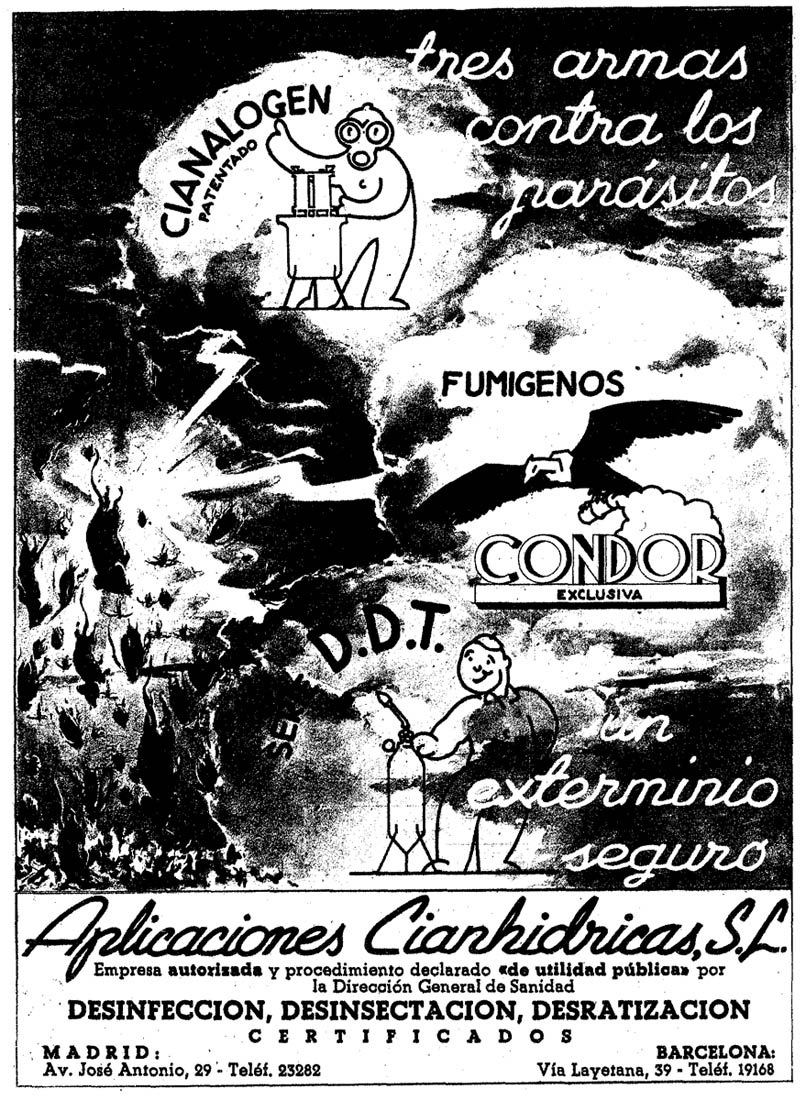 aplicaciones-1946 Previous Next Publicado 28/11/2013 en 806 × 1100 en Un portacebos de Aplicaciones Cianhídricas Foto 3. Anuncio publicitario publicado en el periódico La Vanguardia el 16 de julio de 1946, página 16.
