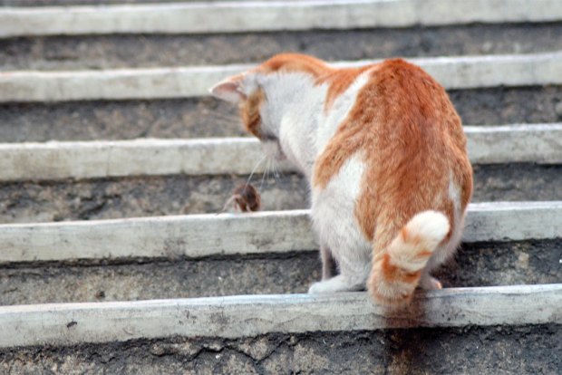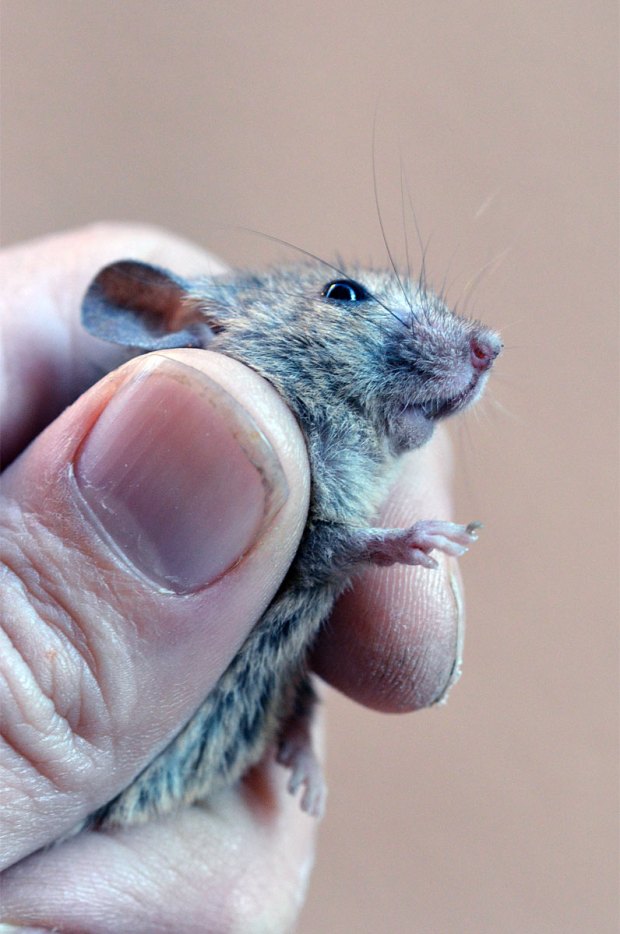 Ayer por la tarde encontré una gata jugando con un ratón doméstico (Mus musculus) en una escalera. Saqué la cámara e intenté hacer una foto de tan simpática estampa. Pero el ratón iba arriba y abajo y no salía a foco. Dejé la cámara en manos de mi mujer y fui a por el ratón. Lo intenté coger del cuello, pero no lo hice del todo bien. Giró su cuello y clavó sus incisivos en mi dedo índice. Por suerte, mordió en carne. No hubo sangre. Le apreté fuerte en las mandíbulas para que me soltara. Pobrecico. No costó apresarlo. Estaba agotado y asustado. Su sufrimiento intentando zafarse de una gata y luego de un humano debió de ser de infarto. En casa lo dispuse en una caja. Le puse comida y agua. El ratoncito era muy mono. La idea era soltarlo en la montaña después de tenerlo algunos días para hacerle unas fotos. Esta mañana, cuando he ido a verlo, estaba muerto.