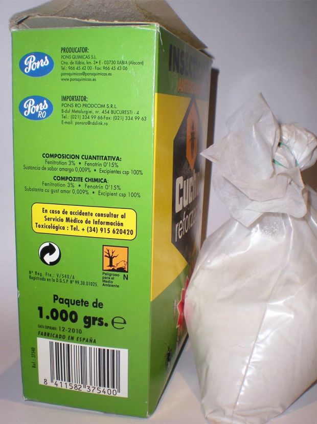 [4] En la imagen número 3 se puede ver CUCHOL PLUS POLVO (núm. de reg. 10-30-05706) que contiene el piretroide permetrina al 0’8%. No está registrado por Pons Químicas, sino por Zelnova SL.