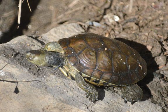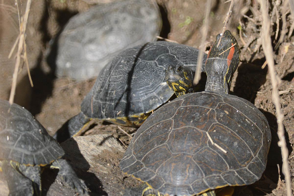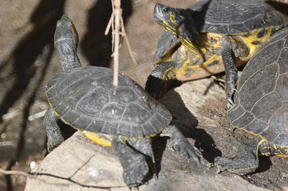 Foto 1. Tortugas de orejas rojas en primer plano. Al fondo, un galápago leproso./ Desinsectador 12-2013