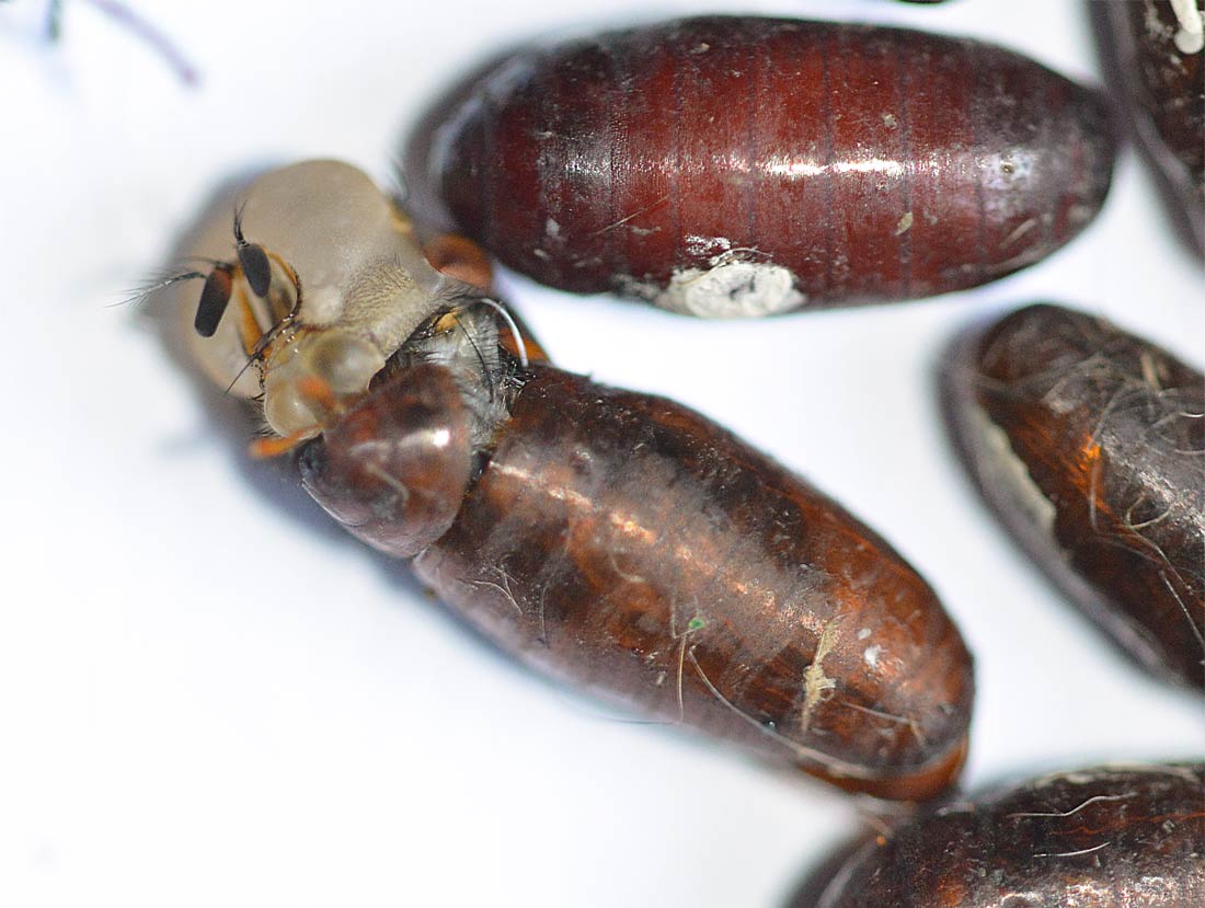 Esta mañana he ido a mirar el frasco donde estaban las pupas y he visto que empezaban a emerger las moscas (figura 5 a 14). Había leído cómo se las ingenian para salir de su estado de pupa, pero no había tenido el gusto de presenciarlo. Ha sido muy bonito. Según he visto, la mosca hincha la cabeza y la presión rasga la cubierta que la protege del exterior. Sucesivamente, la mosca va reptando como un gusano hasta que logra emerger. Entonces boca arriba se agarra a la cubierta vacía con sus patas. Tras estar menos de un minuto así, se da la vuelta y busca refugio. Todavía no tiene las alas desplegadas. En poco tiempo, estas se van extendiendo. Había cerca de 40 pupas en el pote. Han salido todas, he abierto la ventana y las he hecho marchar. Espero que en las fotografías se aprecie lo que comento. La metamorfosis que padecen las moscas es una experiencia increíble. Nacen como larva y luego se transforman para volar. Se puede decir que nacen dos veces.