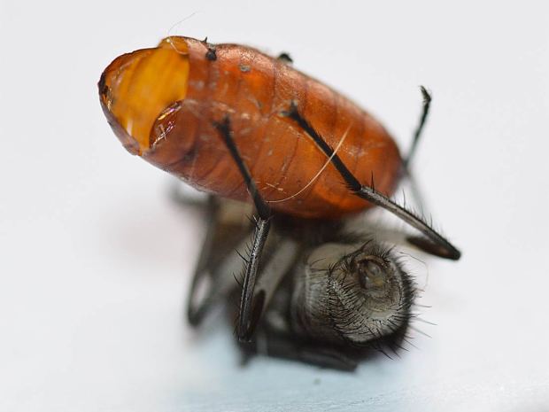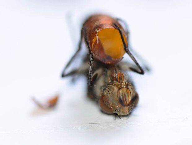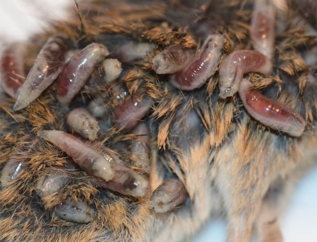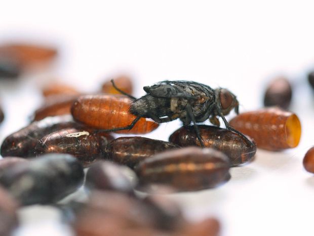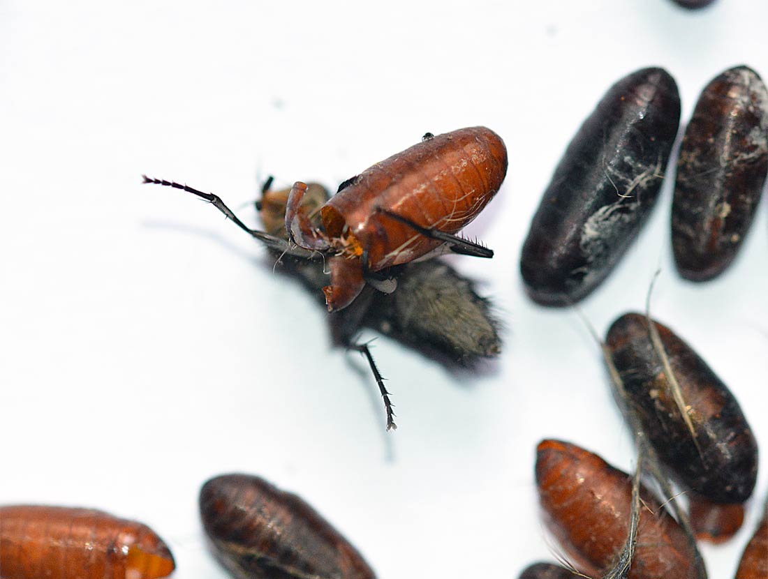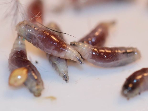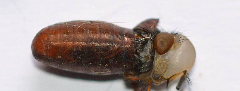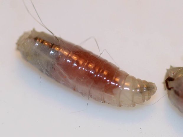 El pasado mes de noviembre recogí unas larvas de moscarda que se estaban alimentando de un ratón doméstico (figuras 1 a 4). Me parecieron unas larvas diferentes a otras que había visto por el fuerte color rojo en su parte central. Sin embargo, al cabo de unos días, adquirieron el color blanco céreo carasterístico. Y poco después pasaron al estadio de pupa. Las recogí en noviembre, así que pensé que podrían pertenecer al género Calliphora, puesto que las moscardas de este género son comunes en la zona donde vivo sobre cadáveres durante todo el año. En concreto, la especie común es Calliphora vicina, que se caracteriza por la cara roja [1].