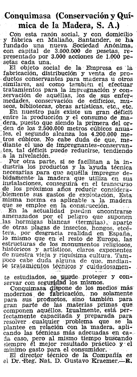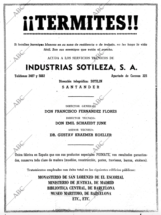 Gustav Kraemer fue un biólogo alemán instalado en España que desempeñó un importante papel en la lucha contra la termitosis (figura 3). Su gran conocimiento y desempeño tuvo tres ejes. Escribió libros que abarcaban la problemática con tada amplitud. Promovió la fabricación de productos protectores de la madera en Industrias Sotileza SA (figura 4). Y fundó la empresa Conservación y Química de la Madera SA para la realización de tratamientos contra xilófagos (figura 5). Es muy importante su labor porque dio solución a muchos problemas que hasta entonces parecían insolucionables. De todas las obras de restauración que realizó, destaca su contribución al control de termitas en El Escorial.