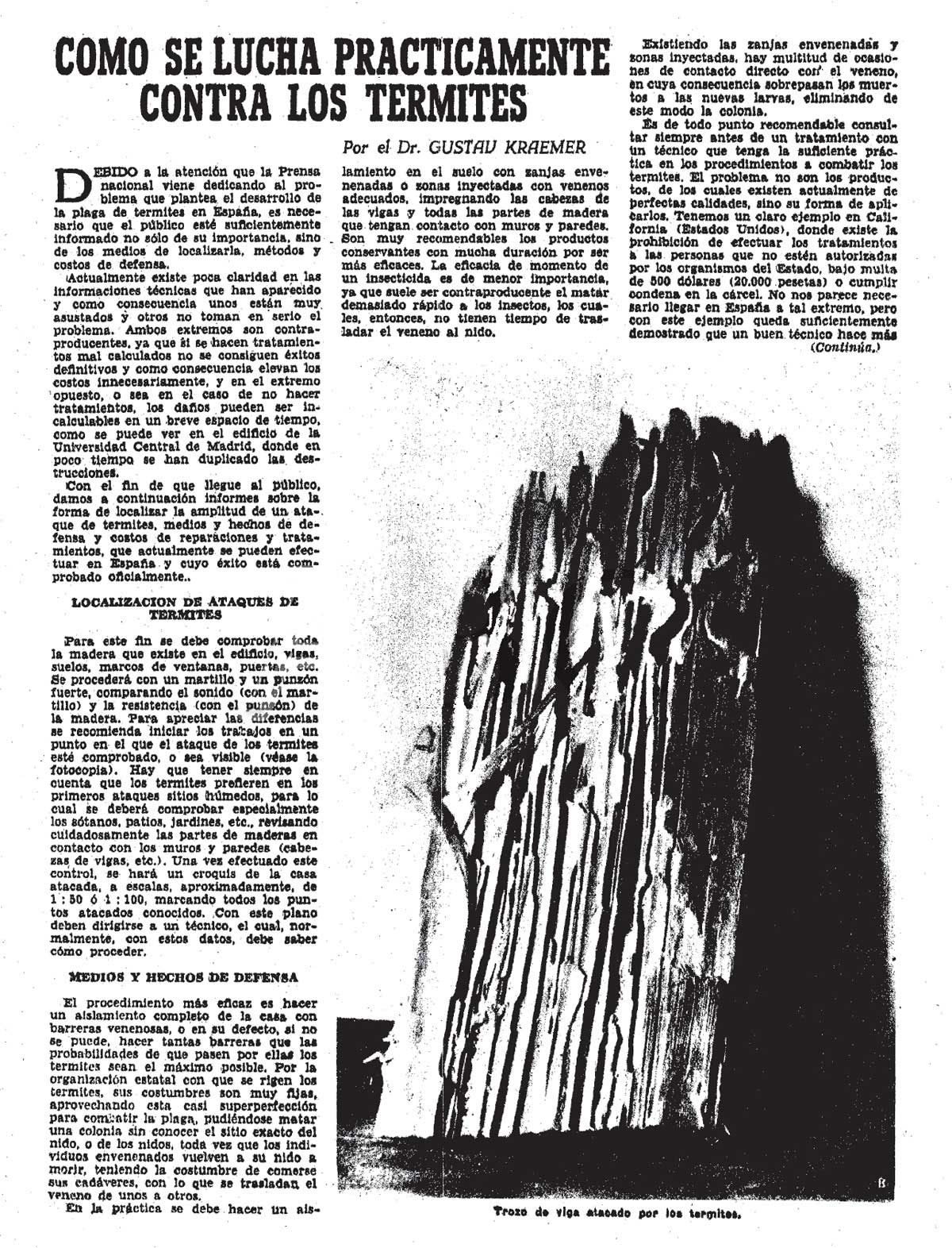 He encontrado en la hemeroteca del periódico ABC un artículo de 1956 escrito por Gustav Kraemer Koeller (1925-1992) sobre los medios de lucha contra las termitas. Es muy interesante para hacerse una idea de cómo se trataban los edificios afectados y de los insecticidas empleados. El artículo es de tipo divulgativo destinado a un amplio público. El artículo fue publicado el 21 de septiembre de 1956 y ocupaba la totalidad de las páginas 15 y 19. Al final de esta entrada se encuentra una reproducción del artículo (figuras 1 y 2).