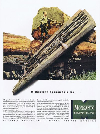 El pentaclorofenol fue introducido hacia 1936 como protector de la madera [2]. En 1938 fue publicada la patente de Wesley C. Stoesser para Dow Chemical en el que se describe un método de obtención a partir de la cloración del fenol [3]. A partir de entonces empezó a usarse a gran escala en EU para proteger la madera contra hongos e insectos. Los principales productores fueron compañías químicas como Dow Chemical o Monsanto. En esta entrada se pueden ver anuncios de la época donde resaltan las ventajas del tratamiento de la madera con pentaclorofenol. Además de alargar mucho la vida útil de la madera, era una opción económica.