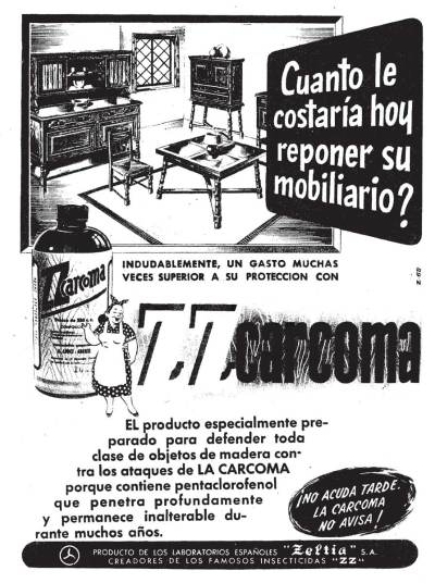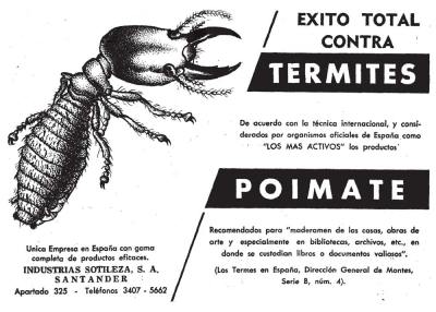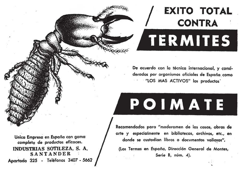 En España había diversos productos para su uso profesional en el control de xilófagos. Por una parte estaban los productos de la empresa química Monsanto. Estaba el Santophen con pentaclorofenol, y el Santobrite con petaclorofenato de sodio. Estos fueron muy consumidos a nivel mundial. Junto a estos había la gama de productos Poimate de Industrias Sotileza de Santander. Poimate también vendía productos para proteger la madera para uso doméstico (figura 4). Para particulares también había el ZZ Carcoma de la casa Zeltia (figura 5).
