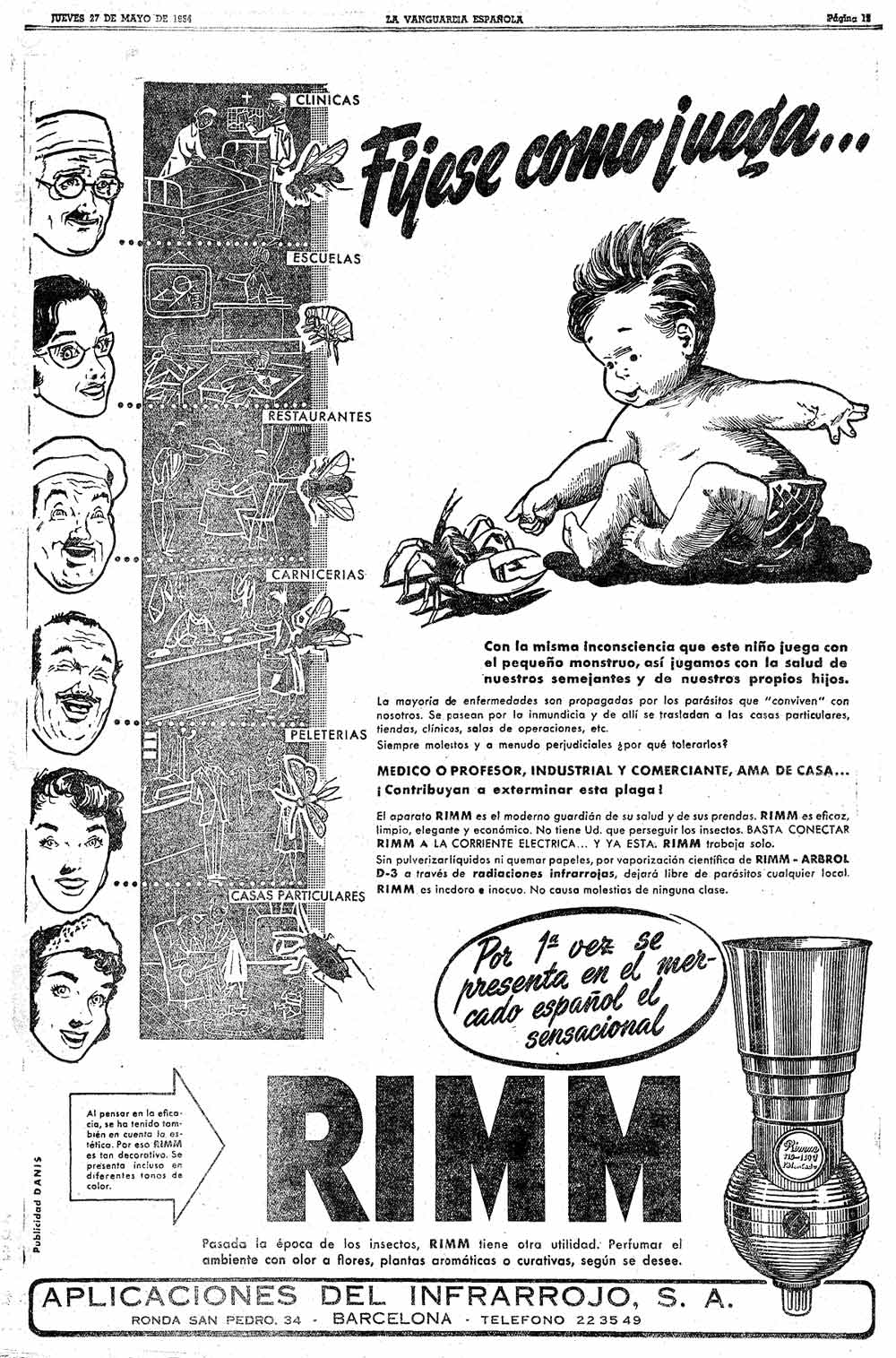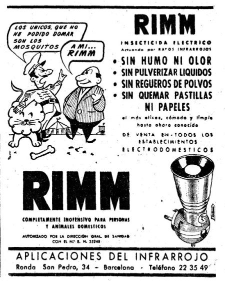 Hace unos días publiqué una entrada sobre evaporadores eléctricos, también llamados vaporizadores [1]. Hoy me he encontrado con un aparato que no conocía. Se llama Rimm y fue comercializado en España en 1954. Es decir, un año antes de que apareciera Vaporol en los anuncios publicitarios. Rimm fue anunciado en diversos medios de prensa [2]. El más antiguo que he encontrado es del 27 de mayo de 1954 en el periódico La Vanguardia (figura 2). Se anuncia como una alternativa a la combustión de papeles fumígenos o a la pulverización de líquido insecticida. Tiene forma de recipiente, ya que en su interior se introducía el insecticida que se evaporaba mediante radiaciones infrarrojas. Es por esto que la compañía comercializadora se llama Aplicaciones del Infrarrojo, según consta en el anuncio, y tenía la sede en la Ronda San Pedro de Barcelona. Este aparato es de origen extranjero. He localizado aparatos parecidos en EUA de unos años antes.
