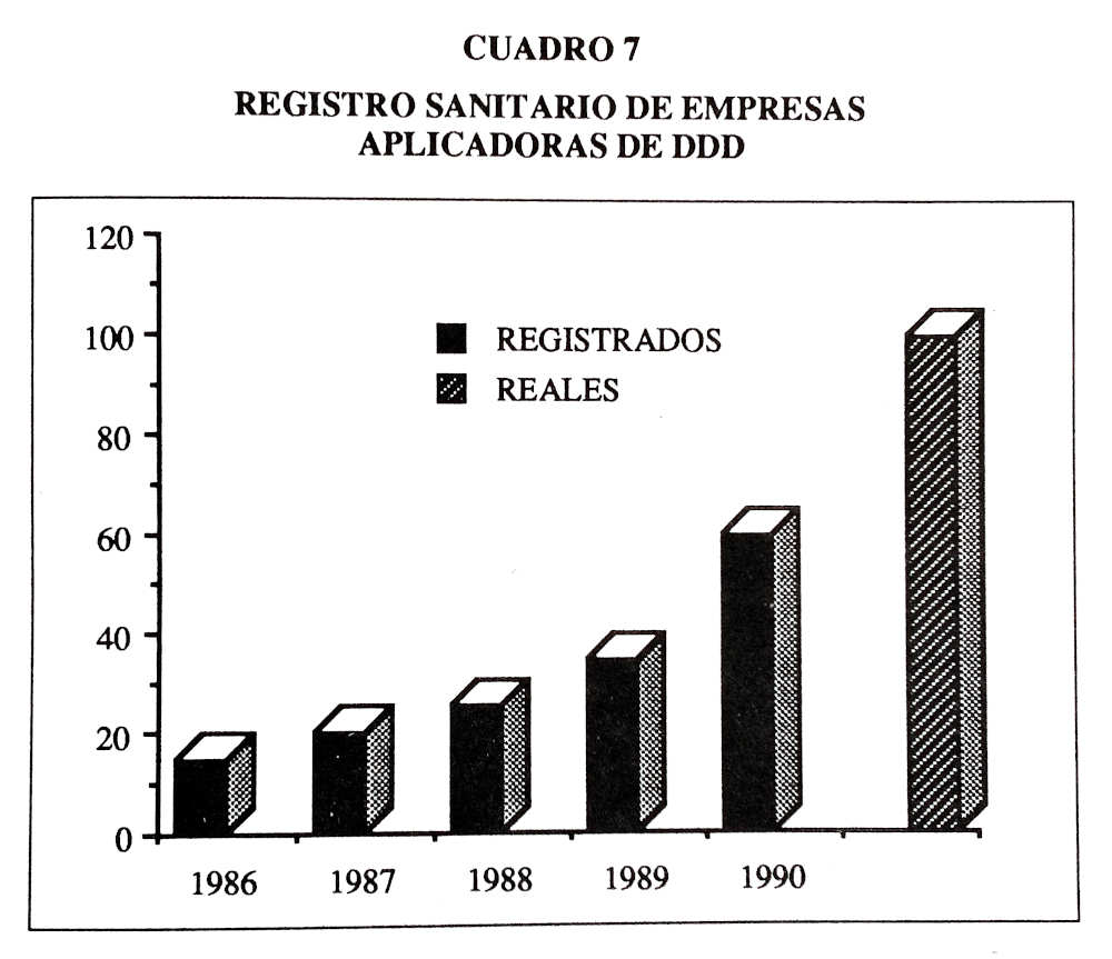 Del libro, destacaría tres capítulos (III, VIII y IX) y un listado con los productos plaguicidas declarados por las empresas que respondieron el cuestionario (Anexo II). En el capítulo III (Análisis de situación de la lucha antivectorial en la Comunidad de Madrid) se da cuenta de cómo se lleva a cabo el control de plagas por parte de la Administración. La lucha antivectorial se encuentra en manos de algunos ayuntamientos que tienen unidades específicas. Pero en general, se encuentra liberalizado en manos de empresas particulares. Se explica que la Comunidad de Madrid creó el Registro Sanitario de Empresas (RES) aplicadoras de tratamientos DDD. En 1987 la Consejería de Salud sistematizó los requisitos sanitarios de la inscripción en el RES y promovió que las empresas se registraran. Según la figura 7, se observa que en 1990 solo habían registradas 60 empresas. Se estimaba que esto representaba el 45% de las empresas que operaban.