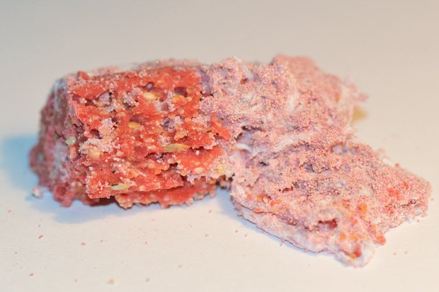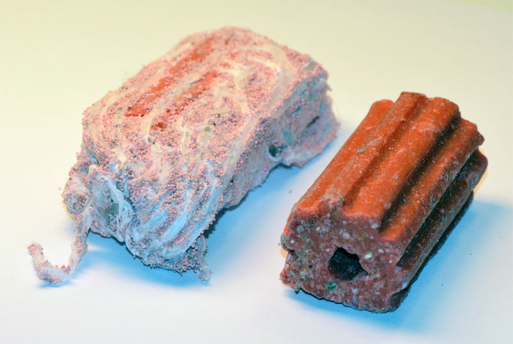 Fig 1. Dos bloques de rodenticida Solo Blox. El de la izquierda está cubierto por las sedas de los tejedores (Embioptera)./ C. Pradera 02-2014