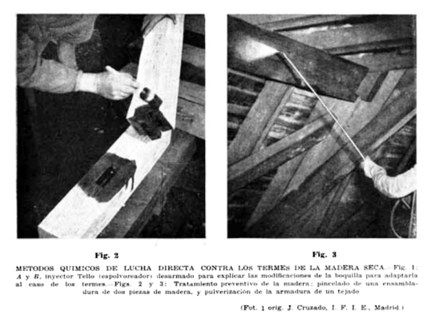El primer título es ‘La investigación de las alteraciones micológicas de la madera’, de 1943 [2]. El segundo es ‘Conservación de maderas en sus aspectos teórico, industrial y económico. Volumen 1’, de 1952 [3]. Solo fue editado el primer tomo y trata principalmente sobre la creosota. Debía constar de 4 tomos más. De publicarse, hubiera constituido una magna obra. El tercero ‘Los termes en España. Biología, daños y métodos para combatirlos’, de 1956 [4]. Este texto fue ampliado y publicado de nuevo en 1958 [5]. Y el último que destaco es ‘Investigaciones sobre los termicidas y maderas resistentes a los termitos’, de 1963 [6]. Estos libros están disponibles en páginas web de venta de libros descatalogados. Yo he adquirido algunos para mi biblioteca.