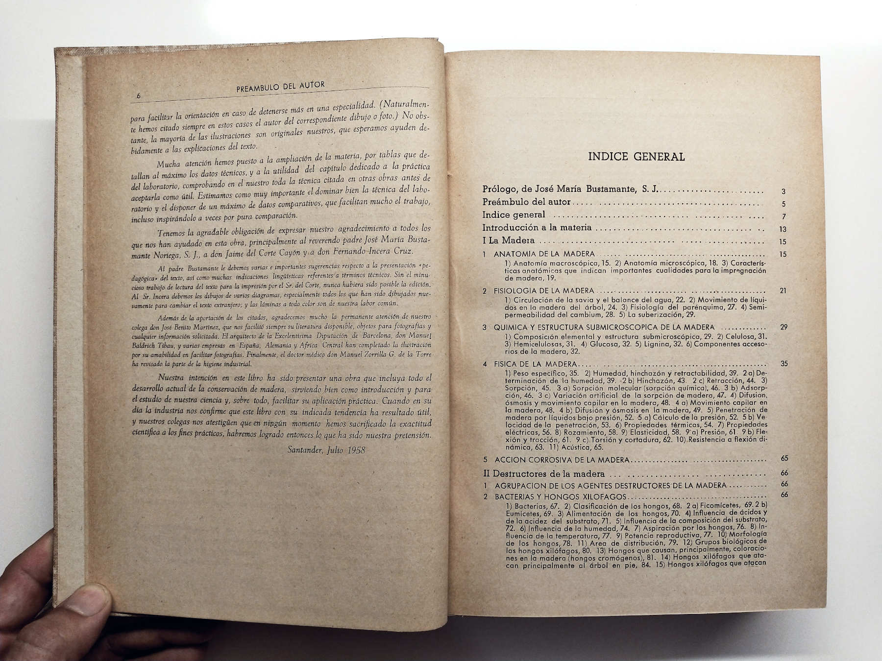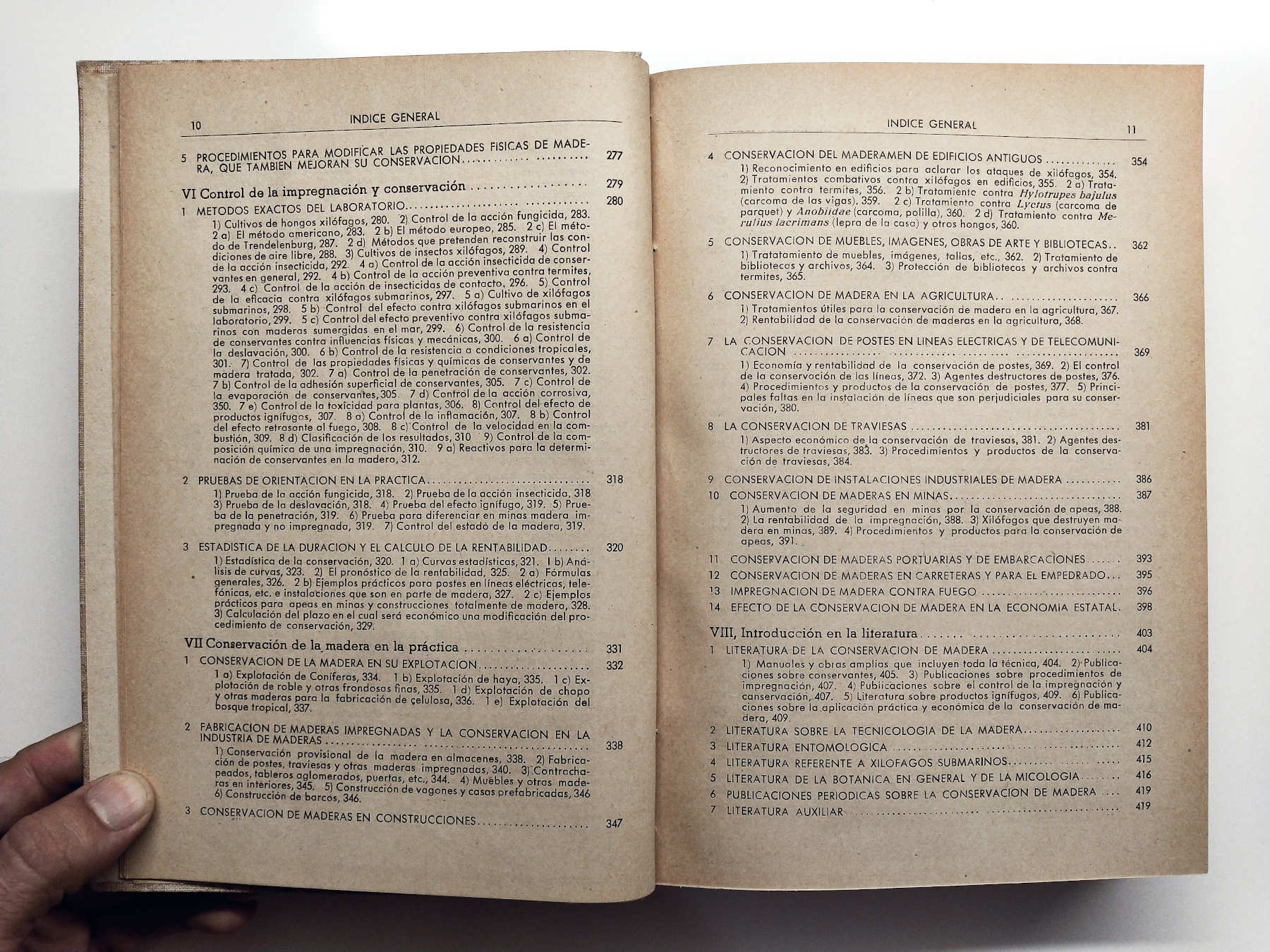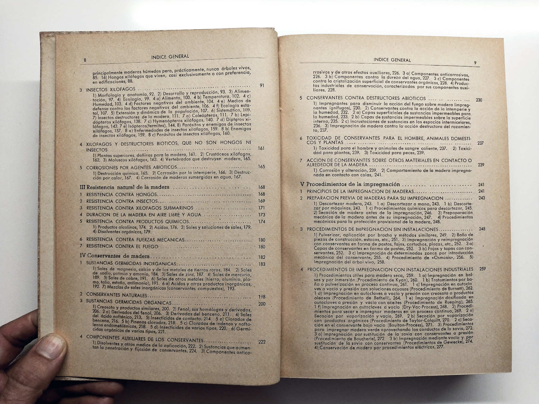 Uno de los libros más importantes que escribió fue el ‘Compendio de la conservación de maderas’. Una obra extensa de 528 páginas llena de datos interesantísimos. Contiene numerosas fotografías, figuras y gráficos. Para hacerse una idea de su contenido enciclopédico baste mirar el índice general (figuras 3 a 6). La parte que a mí me interesa es la parte dedicada a la conservación de la madera de edificios antiguos, puesto que habla del ataque de xilófagos y su control. Gracias a este libro he podido completar mi conocimiento de cómo se realizaban los tratamientos contra hongos, termitas y coleópteros.