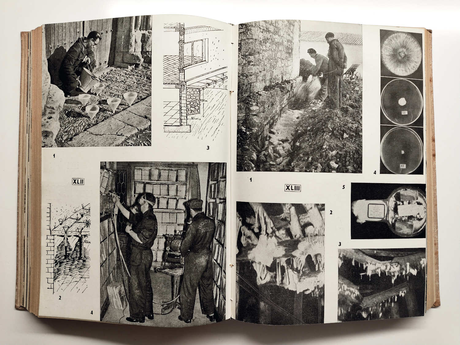 Una grata sorpresa ha sido que me he encontrado con algunas imágenes sobre tratamientos contra termitas. En la imagen número 9, se pueden ver las dos páginas donde aparecen estas imágenes y algunos esquemas. Se puede ver un hombre vertiendo insecticida en el suelo a través de unos embudos o dos hombres impregnando una zanja. En la imagen de abajo, hay dos hombres pulverizando sobre libros. Es interesante que llevan un mono con unas palabras escritas sobre la espalda. Se puede leer Industrias Sotileza SA. Este es el nombre de la empresa que fabricaba el producto Poimate, muy empleado en la época para la conservación de la madera. Este producto lleva en el mercado más de 50 años [2]. Por lo que sé, Gustav Kraemer trabajó en esta empresa hasta 1959, por lo menos. Era asesor científico en la elaboración de protectores de la madera y asesor técnico para la realización de tratamientos.