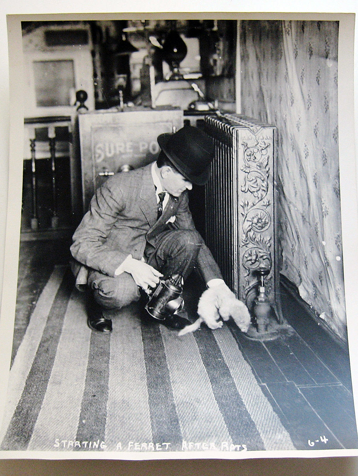 He encontrado a la venta en Ebay cuatro magníficas fotos de la caza de ratas con hurones [1]. Estas fotos pertenecen a una serie de la colección de la Biblioteca del Congreso de los EUA y fueron realizadas a principios del siglo XX. Seguramente, habrá más fotos de esta serie. En inglés el hurón recibe el nombre de ferret. Y de aquí deriva la palabra ferreting para definir este tipo de caza.