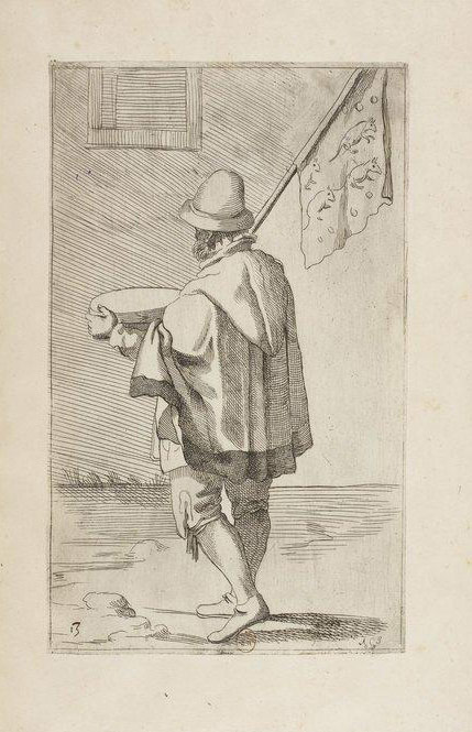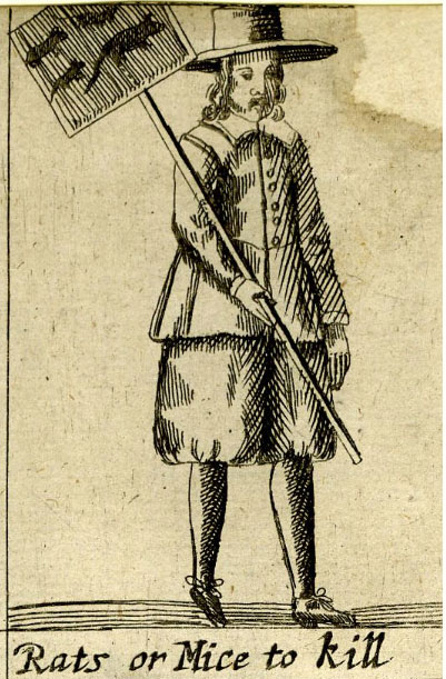 En otras imágenes de la época y anteriores, del palo suele colgar un pendón con ratas dibujadas. Esta sería una heráldica humilde y bien clara del oficio. En la imagen número 2 se puede ver un grabado del siglo XVI del artista italiano Annibale Carracci. En la imagen número 3 se puede ver otro grabado parecido. Se trata de una estampa fechada en 1616 donde un cazador lleva un pendón con tres ratas. Este dibujo encabezaba la letra de una balada titulada ‘The famous ratketcher, with his travels into France, and of his returne to London’, la cual fue publicada en Londres por John Trundle [2]. Junto al cazador se ve un perro. A la cintura lleva atada una bolsa. Otro grabado inglés de la misma época fue realizado a Robert Pricke (figura 4). Está fechado en 1655 y pertenece a una serie dedicada a diversos oficios. En el extremo del palo, en vez de llevar un pendón colgando, lleva una tela con dibujos de ratas atada a una superficie cuadrada. Un grabado realizado en Francia por Abraham Bosse (1602/04–1676) muestra como en ese país es retratado el cazador de ratas (figura 5). Contiene todos los tópicos antes mencionados. Según se puede leer, su dedicación al oficio es como consecuencia de un infortune de guerre, que hará mención al hecho de que le falta media pierna izquierda.