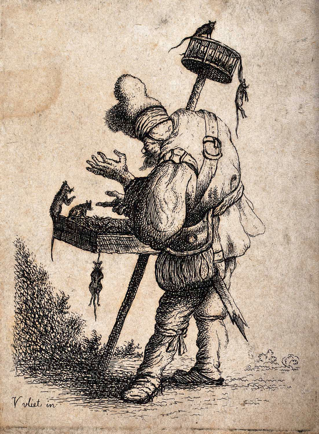 Del mismo siglo XVII tenemos un estupendo dibujo de dibujo del gran artista holandés llamado Rembrandt (figura 6). Está fechado en 1632. Se puede ver que este cazador sostiene un palo en cuyo extremo hay una jaula con ratas vivas. Sobre el cuerpo del cazador se puede ver alguna rata que corretea. Está dibujado solo y sin la compañía de ningún animal. No sé si Rembrandt se inspiró en un cazador real o si lo hizo en otra obra pictórica. Lo cierto es que la jaula en el extremo se convertiría en un nuevo tópico. Una imagen similar se puede encontrar en un grabado de otro artista holandés llamado Cornelis Visscher (figura 7). El palo que tiene el cazador de ratas es muy parecido al que dibujara Rembrandt. Junto al cazador hay perro y un joven que parece que sea un aprendiz. Este detalle es importante, ya que el cazador de ratas está encarnado en una persona mayor. Quizás sea un símbolo de la experiencia que es necesaria para desarrollar el oficio.