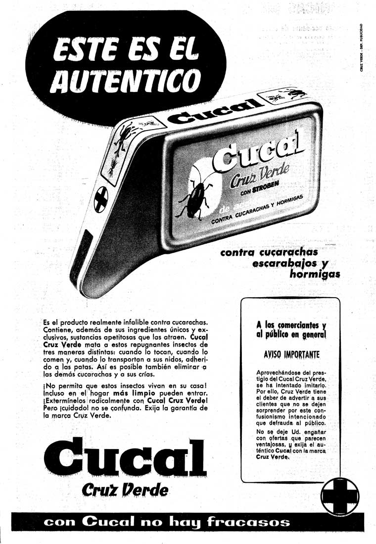 El insecticida Cucal fue comercializado por Cruz Verde de Barcelona a principios del decenio de 1950. El anuncio publicitario más antiguo que he encontrado es de abril de 1951 (figura 1). En el texto se dice que Cucal fue preparado «con la extraordinaria concentración del 25% de DDT». Lo cual significa una composición bastante tóxica que no debía dejar ninguna cucaracha viva, ni tampoco otro insecto rastrero, al contactar con el polvo. Parece que fue formulado para que se adhiriera con facilidad a las patas de los insectos. Además contenía sustancias apetitosas para que, además de actuar por contacto, lo hiciera por ingestión.
