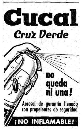 [3] Una duda que tengo es saber qué sustancia activa contenía este Cucal en espray. El DDT no es de acción rápida, con lo cual seguramente fuera una piretrina o piretroide.